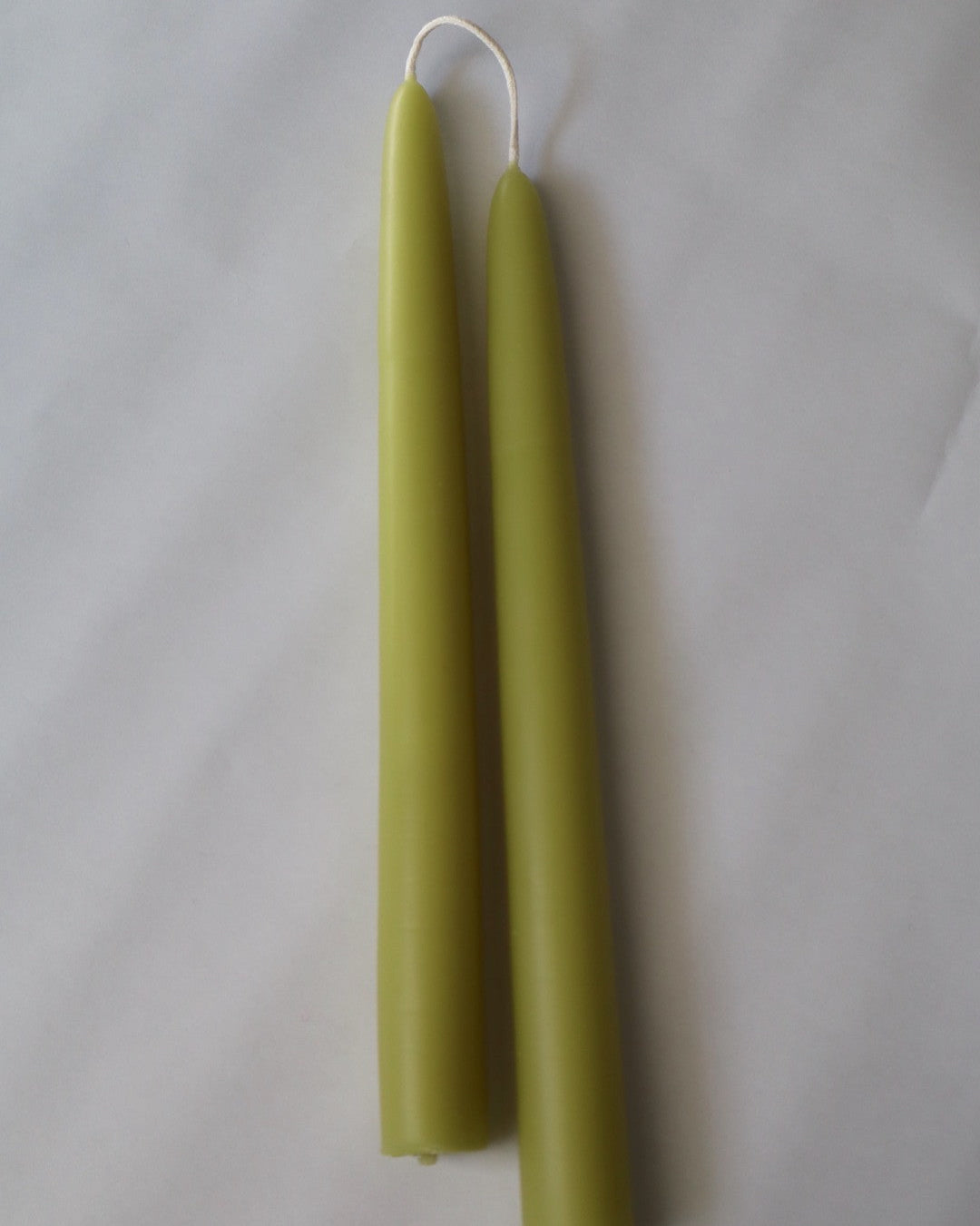 Our taper candles are 9” tall with a burn time of approx. 8hr. Each pair Is hand dipped up to 30 times.